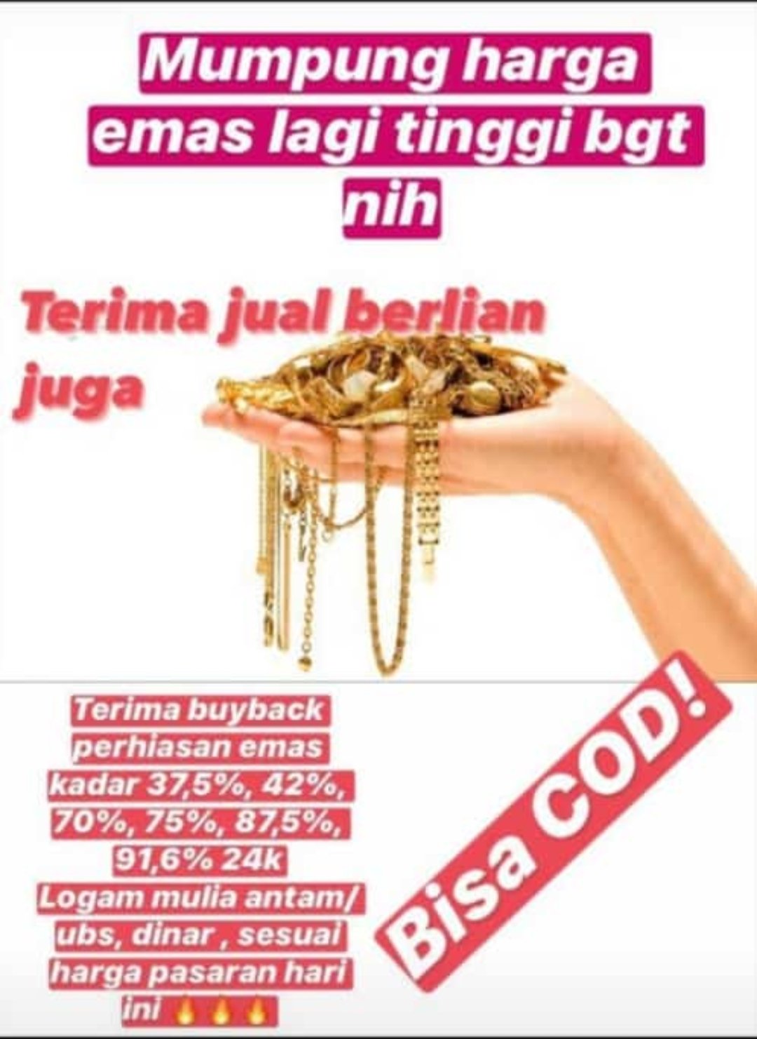 Terima jual emas tanpa surat/beda tokoEmas bagus maupun sudah rusak- Kalung putus- Cincin patah- Gelang rusak- Anting sebelah- Mas jaman dulu- Logam mulia/antam- Mas putih/kuning.- Mas luar negeri/dari kampung- BerlianKirim foto mas + foto cap(code) mas anda.harga cocok tinggal COD/kami jemput kerumah anda.Berat mas anda kami timbang di depan anda.uang Cash bayar ditempat/TF Via M-BankingTanya2 chat aja.Wa 081210548900(https://api.whatsapp.com/send?phone=+6281210548900)